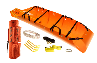 Camilla tipo Skedco o “capullo” para rescate técnico y espacios confinados, fabricada en polietileno flexible de alta resistencia que se enrolla para transporte y se vuelve rígida al asegurar al paciente.