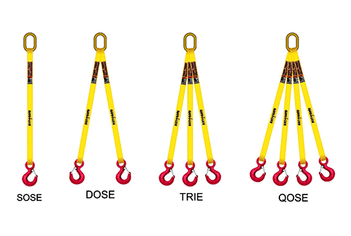 Estrobos de izaje en reata de poliéster con múltiples ramales para levantar cargas de forma equilibrada y segura, disponibles en configuraciones de 1, 2, 3 y 4 patas con anillo maestro y ganchos de seguridad.