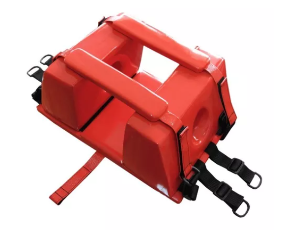 Inmovilizadores de cabeza universales para uso con tabla espinal o camilla cuchara, fabricados en espuma de celda cerrada recubierta y base compatible con múltiples sistemas, para estabilizar la cabeza y evitar movimientos durante el traslado.