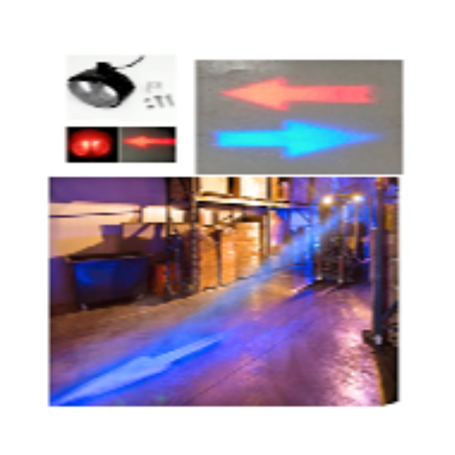 Lámparas de flecha LED para proyección en piso o pared que guía el flujo peatonal o vehicular en bodegas, talleres y zonas de carga, aumentando la visibilidad y la distancia de alerta.